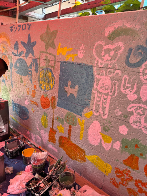 レインボーの壁がひときわ目を引きます(*^_^*)子供たちが思い思いに描いた絵も可愛いですね~♡